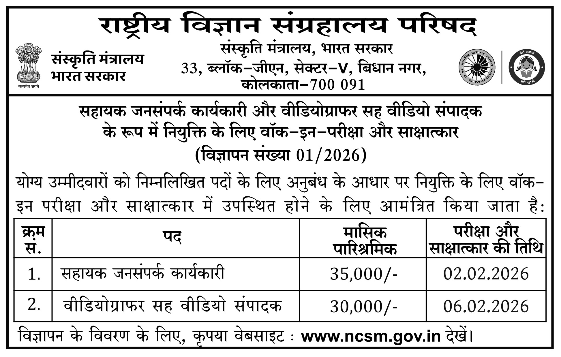 | 2. | Videographer cum Video Editor | 30,000/- | 06.02.2026 |